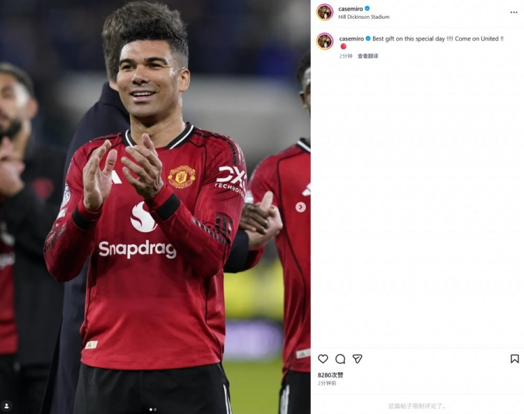 本场赛事 迎来34岁生日的卡塞米罗杆位出场,赛后他也在个人社媒晒出本场赛后庆祝获胜 照片,配文写道:“在这个特殊日子收获最棒的礼物!曼联助威 !”
