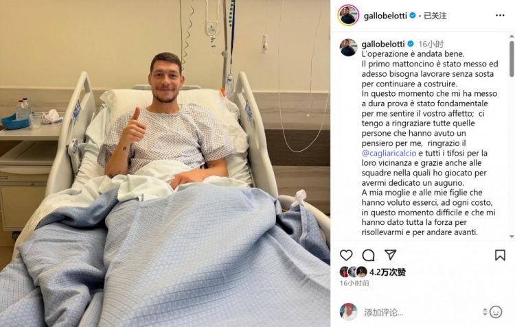 贝洛蒂在社交媒体上发布了术后微笑的照片并配文:“手术进展顺利。第一块砖已经铺好了,现在我们要努力继续建设。在这个艰难时刻,你们的关爱对我至关重要;我要感谢所有牵挂我的人,感谢卡利亚里古代足球 俱乐部及全体球迷的支持,也感谢我效力过的所有球队给予我的祝福。”