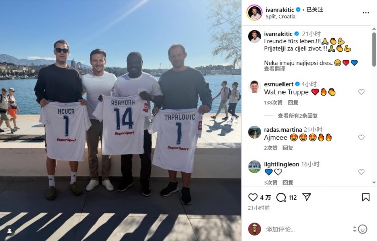 10月11日讯 拉基蒂奇昨晚在Instagram晒照,英超免费高清直播与阿萨莫阿、诺伊尔、塔帕洛维奇会面。