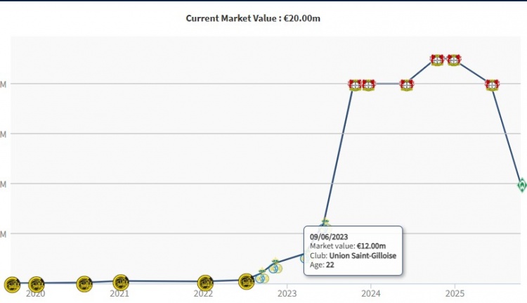 10月14日讯 德转更新球员身价,24岁前场球员博尼法斯从4000万欧跌至2000万欧。