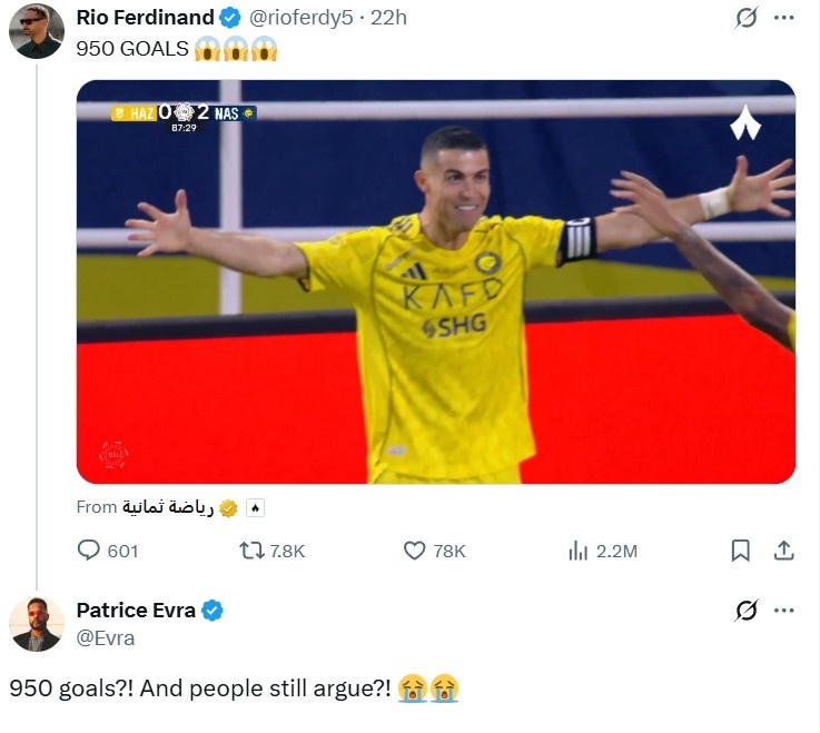 C罗950球!费迪南德感叹C罗得分 数,埃弗拉:竟然还有人在争论?