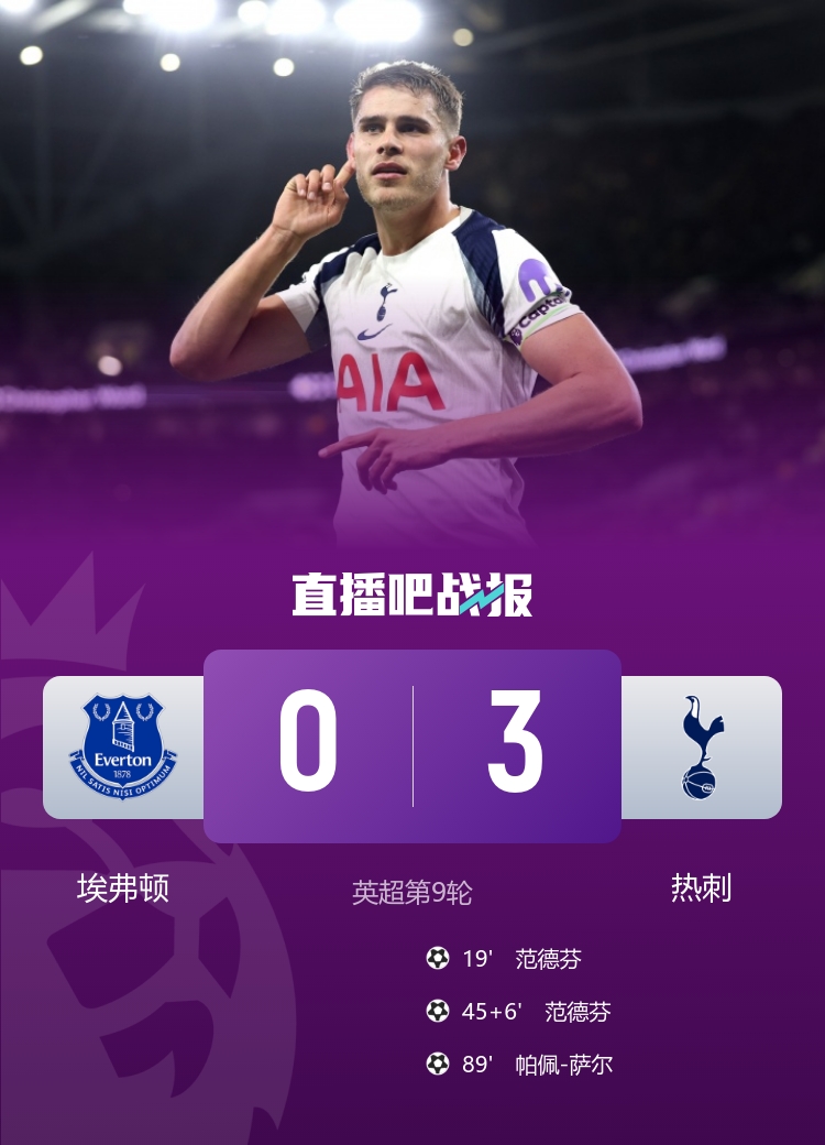 英超第9轮,热刺客场应战 3-0轻取埃弗顿,范德芬连进两球。