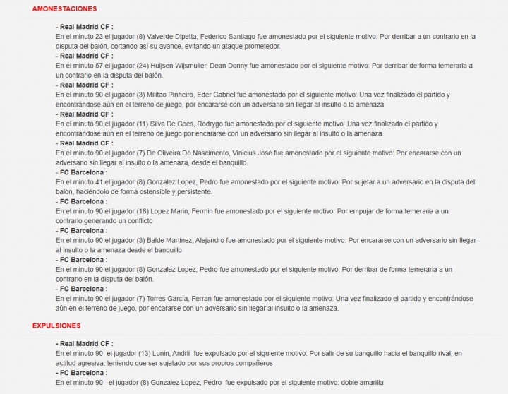 皇萨赛后裁判 报告:卢宁驱逐 ,维尼修斯、费尔明等六人警告