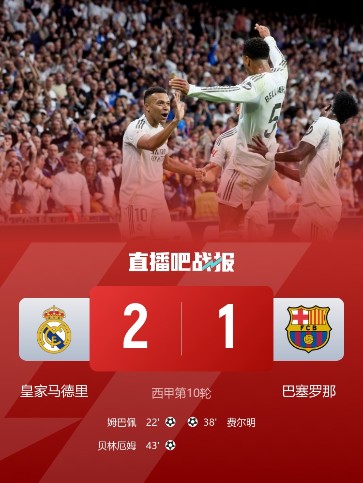 西甲第10轮国家德比,皇家马德里2-1战胜巴塞罗那,姆巴佩破门+失点+2球被吹,贝林厄姆传射。