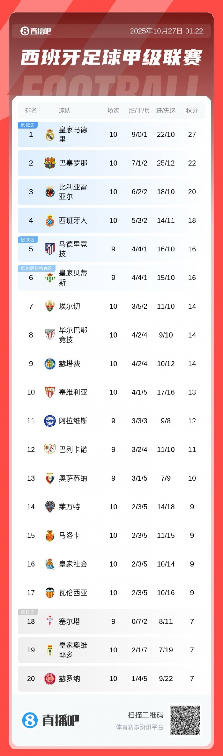 主场作战 复仇!西甲积分榜:皇马5分优势领跑,英超直播巴萨第2,西班牙人第4