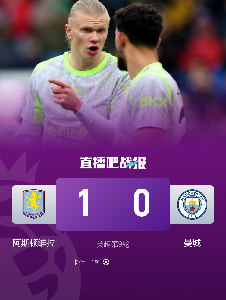 3连胜终结!曼城0-1维拉 哈兰德失单刀赴会连续12场得分 中断 卡什制胜