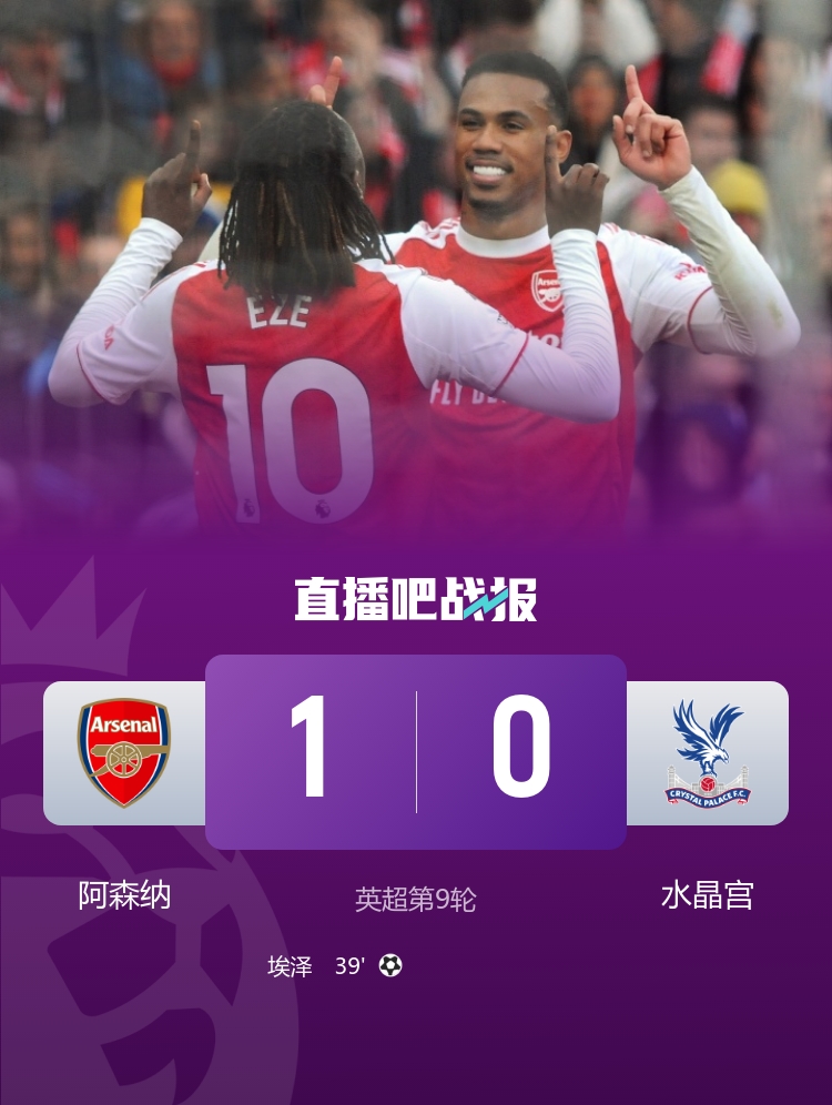 英超职业联赛 第9轮,阿森纳1-0战胜水晶宫,埃泽弑旧主。