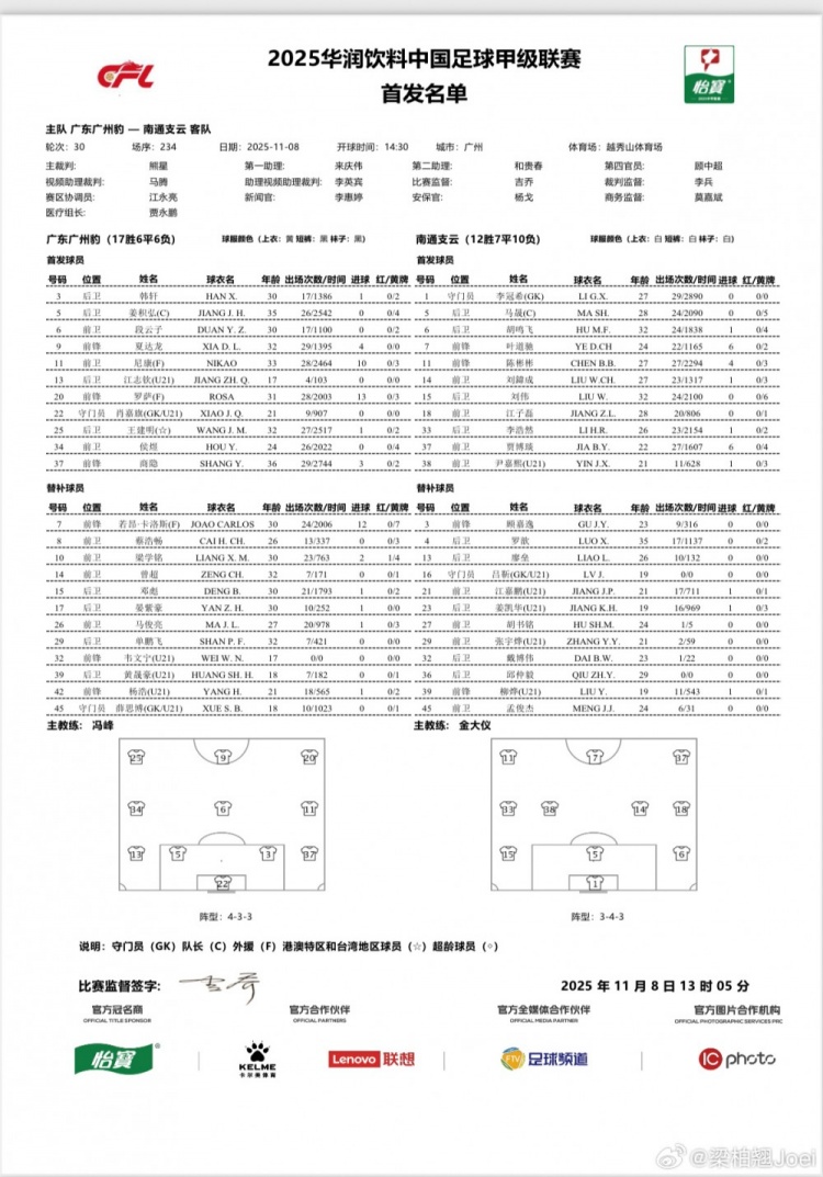 11月8日讯 中甲第30轮,广东广州豹主场作战 对阵南通支云。赛前,英超免费高清直播官方公布了本场的杆位名单。