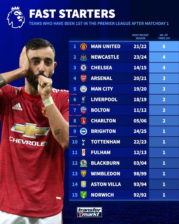 08月15日讯 新赛季英超开赛在即,德转列出了哪些球队在英超第一轮后占据榜首的次数最多,英超免费高清直播曼联以6次排名第一。