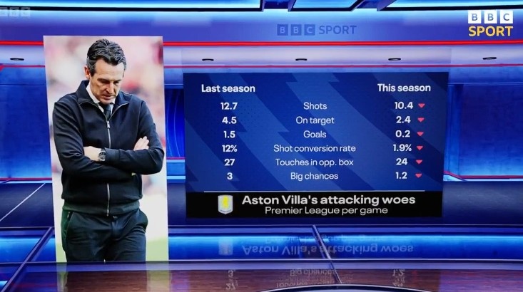 这是维拉本赛季5轮英超打进的唯一得分 ,BBC也盘点了维拉本赛季英超相较上赛季的场均攻击 数据,英超免费高清直播可谓全面下滑,具体如下: