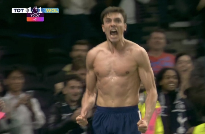 09月28日讯 英超第6轮热刺vs狼队补时阶段,帕利尼亚不停球兜射远角破门,英超直播萨尔助功 ,热刺1-1扳平狼队!随后帕利尼亚直接脱衣庆祝!