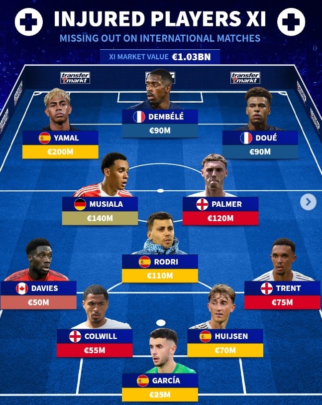 10月10日讯 本次国际赛事 日,多名重量级球星因伤无缘代表国家队出战,这其中包括了新科金球奖得主登贝莱、亚马尔等球员。德国转会市场盘点了因伤无缘国家队赛事 身价最高阵,登贝莱、亚马尔、罗德里、帕尔默、穆西亚拉在列。