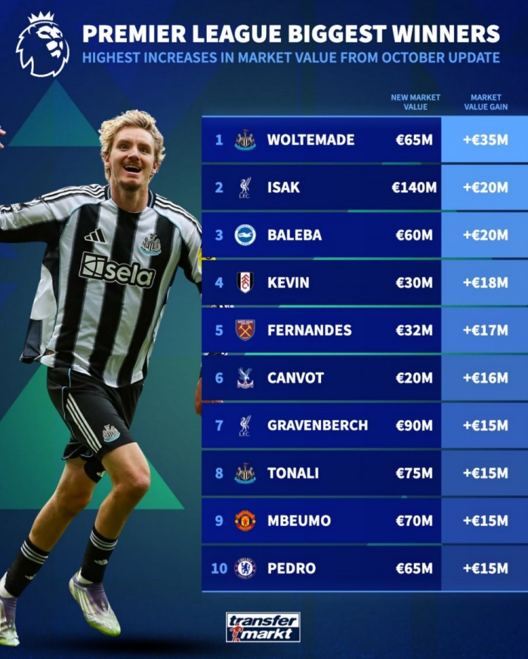 10月17日讯 德转更新了英超球员身价,并盘点了本次身价涨幅最大的10名球员,具体如下(现身价,涨幅):