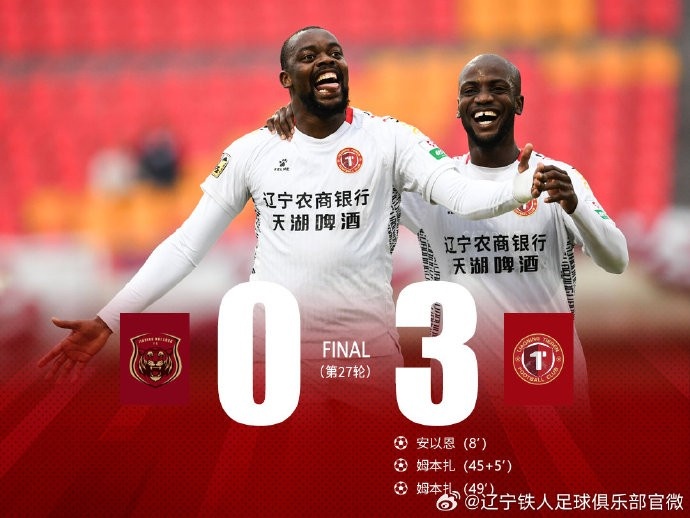 10月18日下午15点30分,2025华润饮料中国古代足球 甲级职业联赛 第27轮,辽宁铁人农商银行客场应战 应战 嘉定汇龙,安以恩为球队首开记录 ,姆本扎连续3场赛事 连进两球,最终客场应战 3-0完胜上海嘉定汇龙。