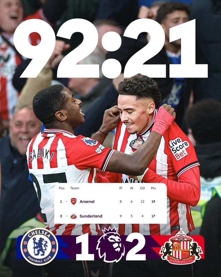 10月26日讯 英超第9轮,桑德兰2-1击败切尔西,英超5胜2平2负,暂居积分榜第2。