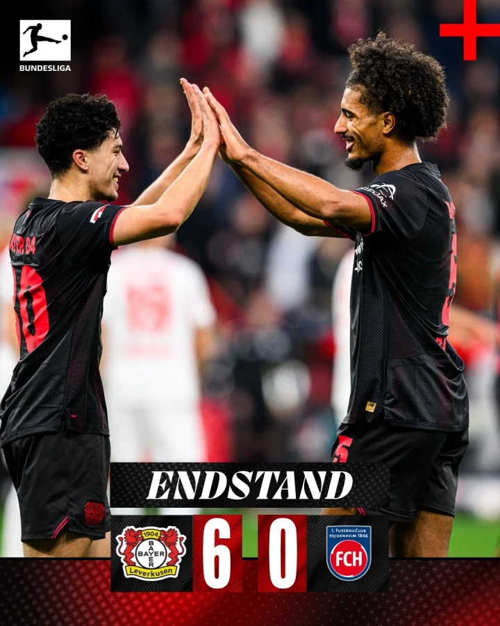 11月09日讯 德甲第10轮,勒沃库森主场作战 6-0大胜海登海姆,排名上升到积分榜第4。