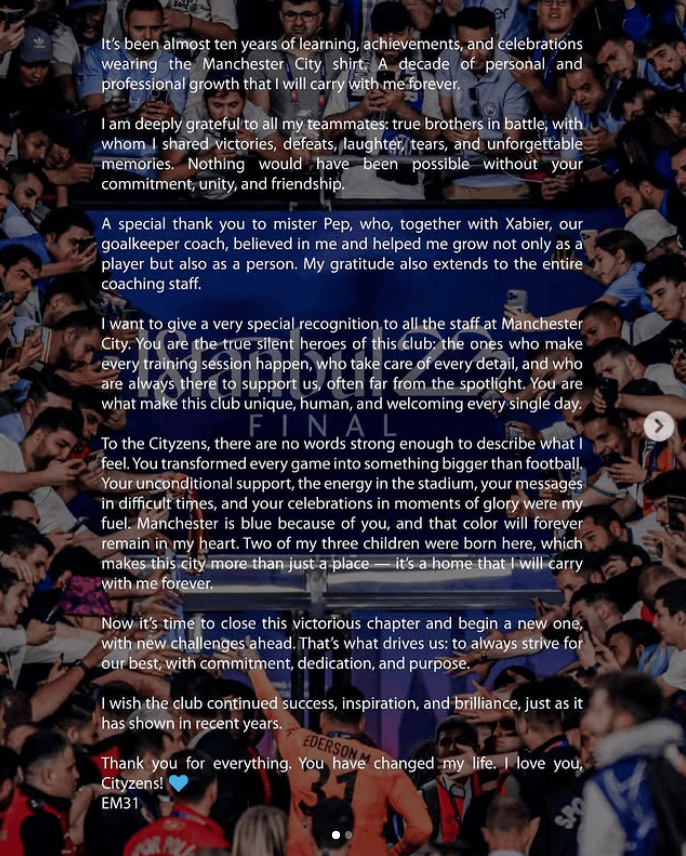虎扑09月02日讯在正式从曼城加盟费内巴切以后,巴西守门员埃德森也在社媒上发文,深情告别了自己老东家。