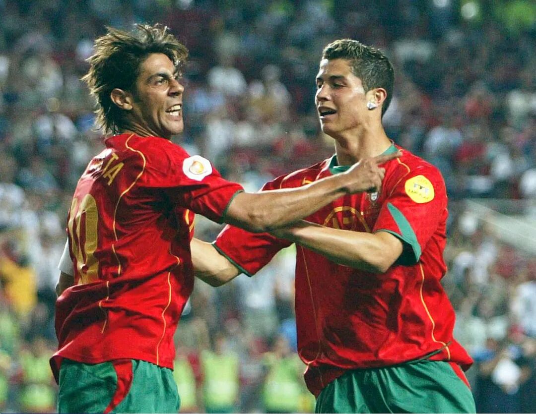 2004年欧洲杯揭幕战对阵希腊。C罗顶球破门,打进个人欧洲杯首球,成为当时欧洲杯首秀破门最年轻的球员。
