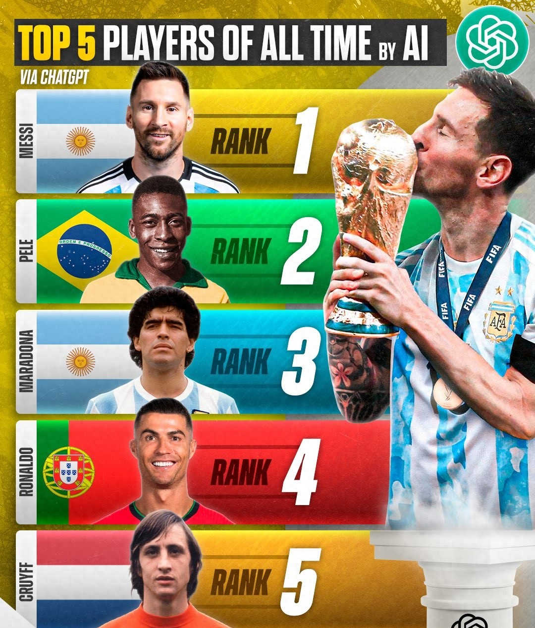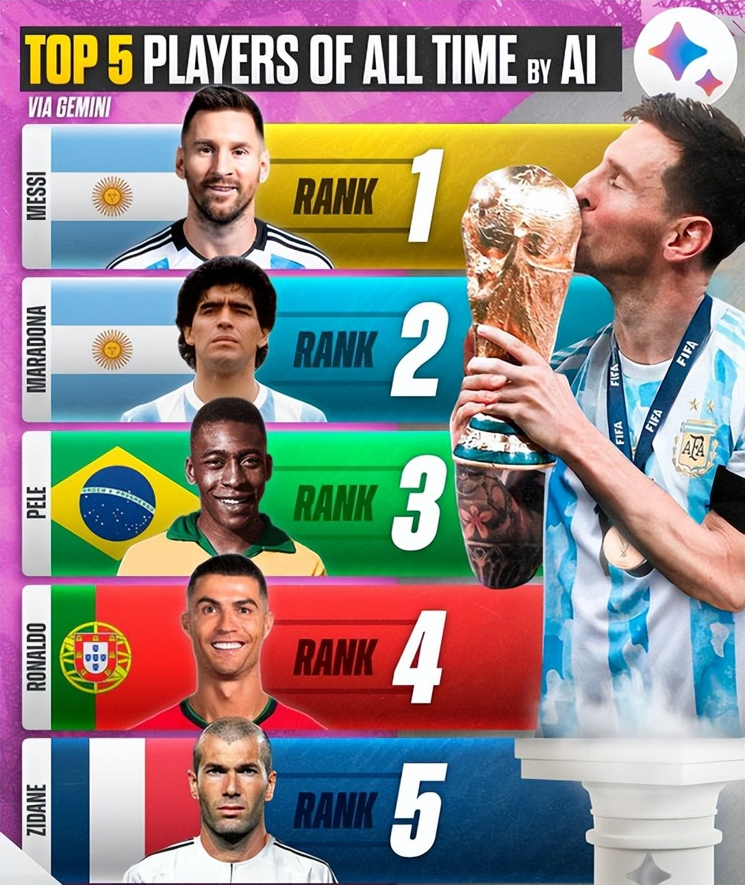 4项AI发布足坛历史最佳球员的排名,其中梅西占据了其中的3项第一
