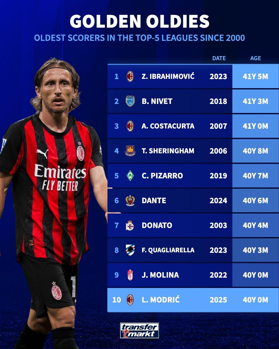 根据统计,英超直播莫德里奇也就此以40岁的年纪成为了自2000年以来在欧洲五大职业联赛 中得分 最年长的10位球员之一,他在这10名球员中位列第10。值得一提的是,排名前10的球员中有3位都来自于AC米兰。