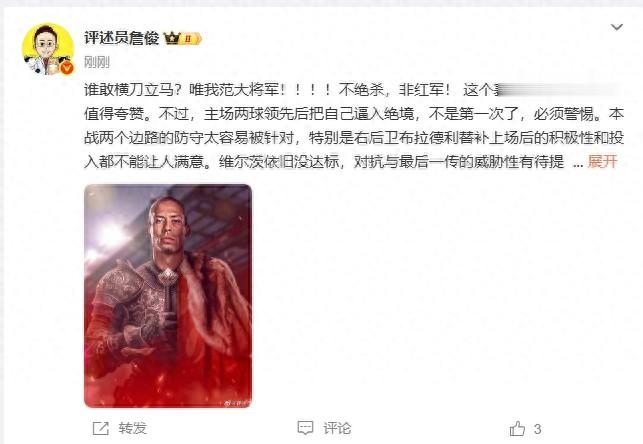 谁敢横刀立马?唯我范大将军!!!!不致胜球 ,非红军! 这个赛季利物浦的韧性值得夸赞。不过,主场作战 两球领跑 后把自己逼入绝境,不是第一次了,英超直播必须警惕。本战两个边路的防卫 太容易被针对,特别是右后场球员布拉德利后备 上场后的积极性和投入都不能让人满意。