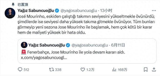 土耳其名记Yağız Sabuncuoğlu发文批评穆里尼奥并置顶推文:穆里尼奥曾经经常以提升球队水平为荣,如今他却以加盟更高水平的球队自夸。