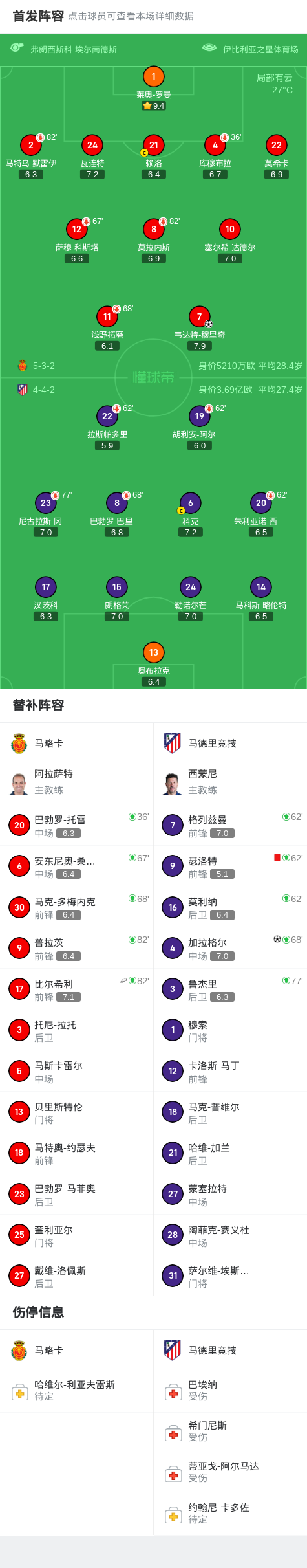 第36分钟,马略卡被动调整,库穆布拉负伤 无法坚守 ,巴勃罗-托雷登场