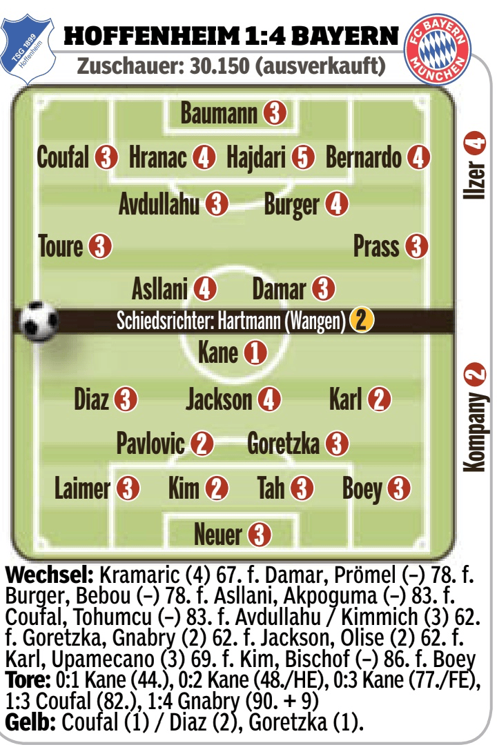 霍芬海姆杆位球员 员评分:鲍曼(3分)、库法尔(3分)、赫拉纳克(4分)、哈吉达里(5分)、贝尔纳多(4分)、阿夫杜拉胡(3分)、伯格(4分)、图雷(3分)、普拉斯(3分)、大马尔(3分)、阿斯拉尼(4分)