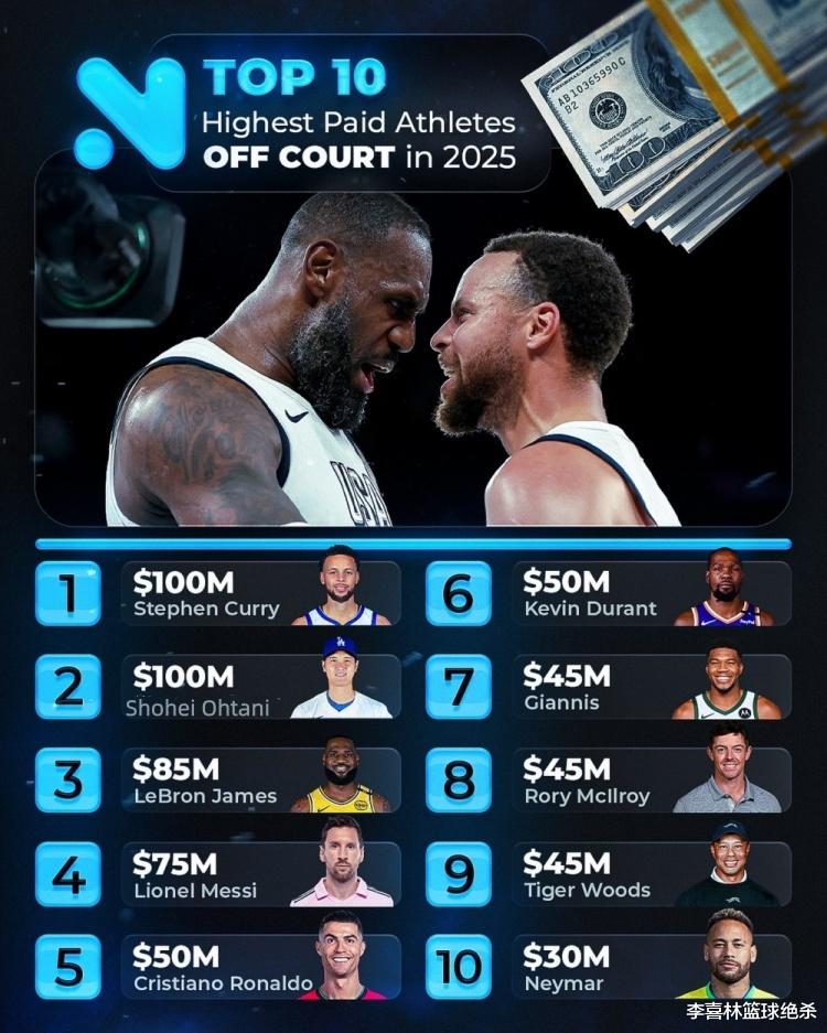 9月23日,美媒统计了2025运动活动 员场外收入前十榜单,勇士球星库里和日本棒球运动活动 明星大谷翔平以1亿美元并列排名第一。詹姆斯8500万美元排名第三,梅西7500万美元第四,C罗和杜兰特5000万美元并列第五。字母哥、麦克罗伊和伍兹都是4500万美元并列第七足球直播,内马尔3000万美元第十。