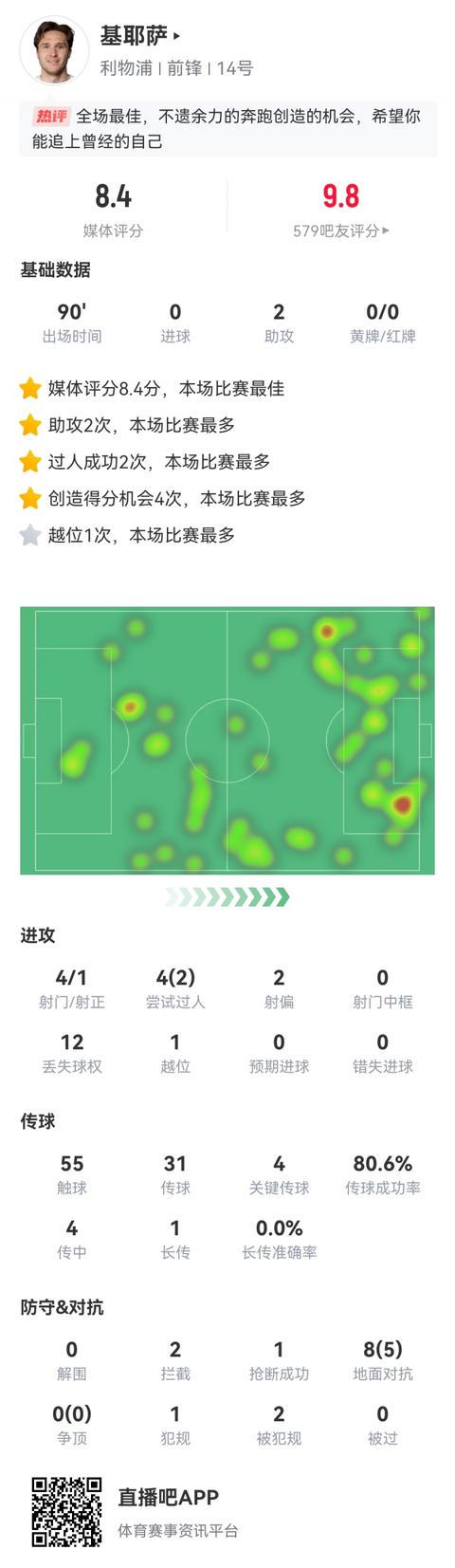 本场赛事 基耶萨的表现绝对亮眼,他2次过人成功并创造了4次积分 机会,均为本场赛事 最多。而他的两次助功 ,一次是通过他的积极拼抄截 球,另一次则是在丝滑停球面对守门员时选择横传。