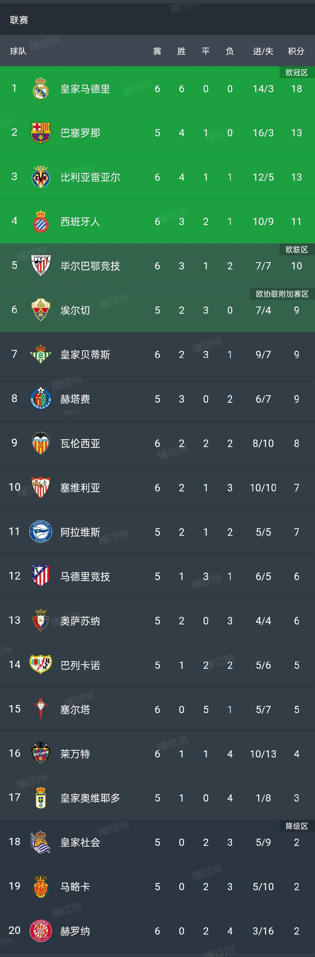 皇家马德里六连胜积18分排在第一位,巴塞罗那少赛一场追赶 5分,排在第二位。