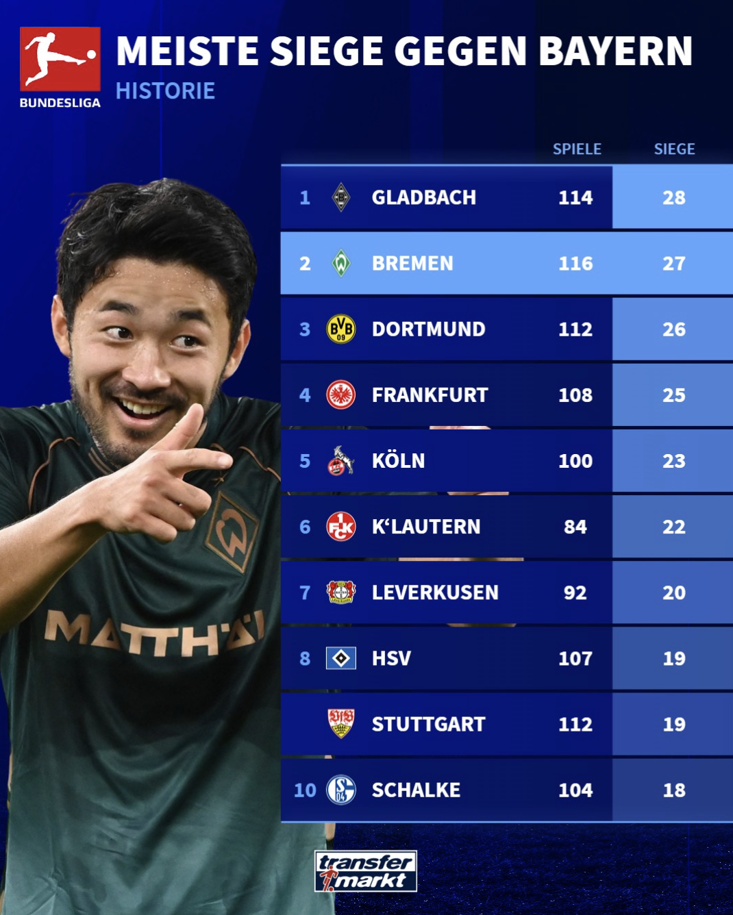 虎扑09月25日讯德转统计了德甲历史上战胜拜仁次数最多的球队榜单。