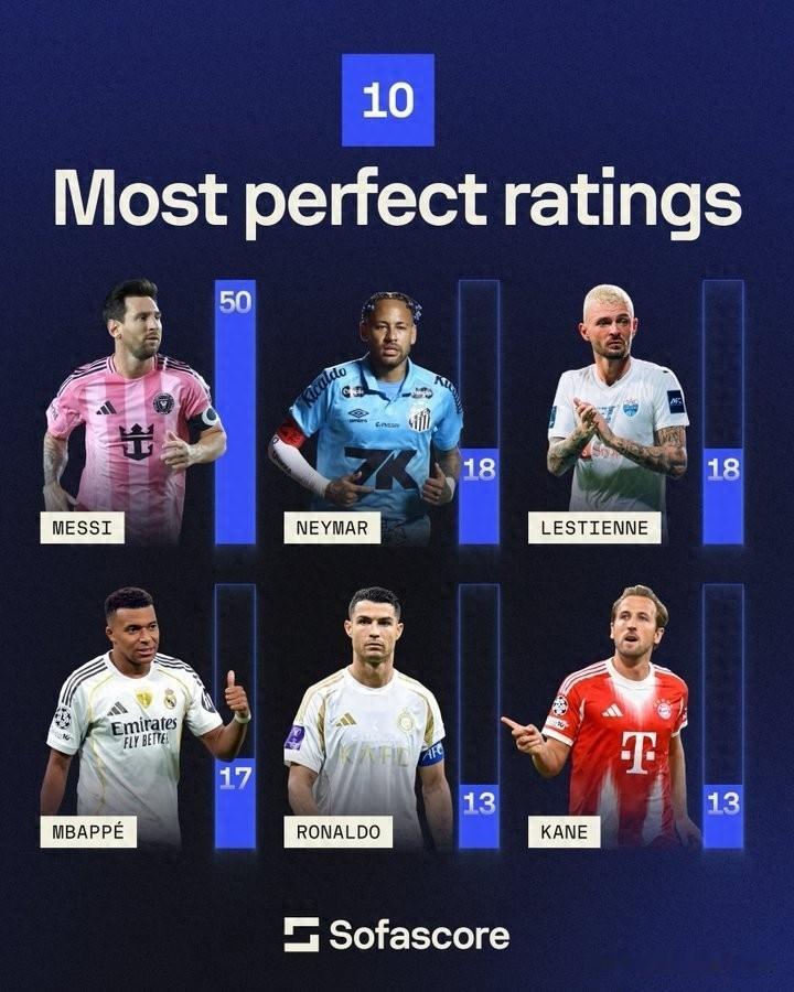 在最权威的评分机构之一SofaScore那里,梅西至今有50次满分10分,历史独一档。从这个数字和身份就能看出梅西到底多厉害,英超免费高清直播但还不够直观,可以参考其他超巨的满分10分数量,更能看出梅西多厉害。
