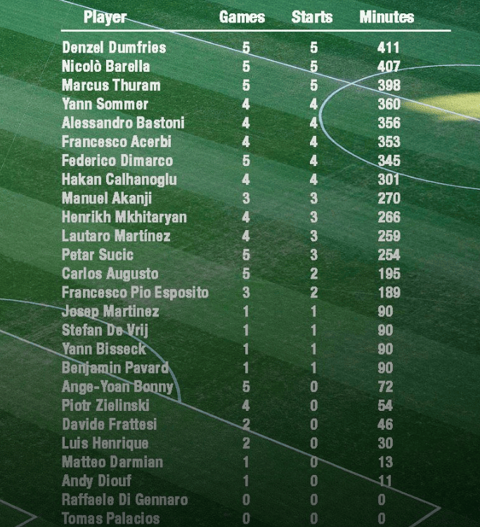 虎扑09月27日讯意甲职业联赛 即将在周末重燃战火,英超直播数据网站也统计了国米球员本赛季的出场时间排行。