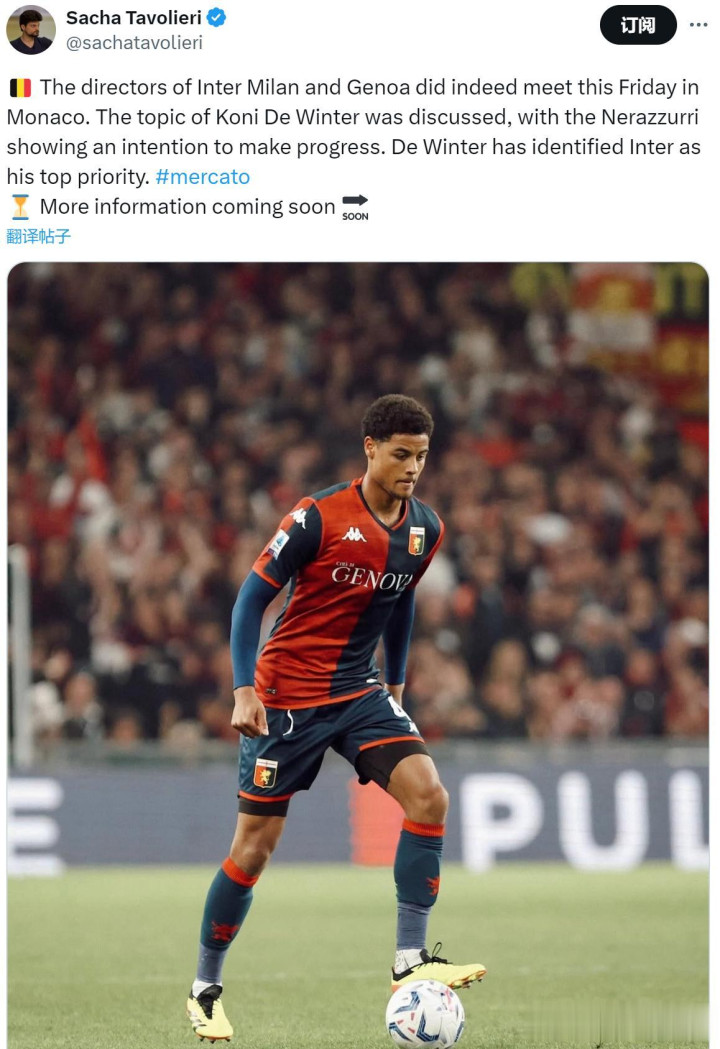 另一则消息,RMC体育、天空台的比利时著名记者塔沃列里(Sacha Tavolieri)介绍:在国米造访摩纳哥进行友情 赛的期间,国米经理与热那亚的经理在摩纳哥进行了一次会谈,讨论了热那亚中后场球员德温特的转会问题。