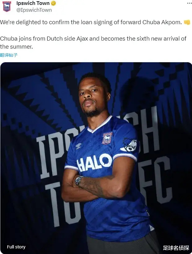 官方:伊普斯维奇宣布从阿贾克斯租借签下了29岁的前场球员楚巴-阿克蓬。
