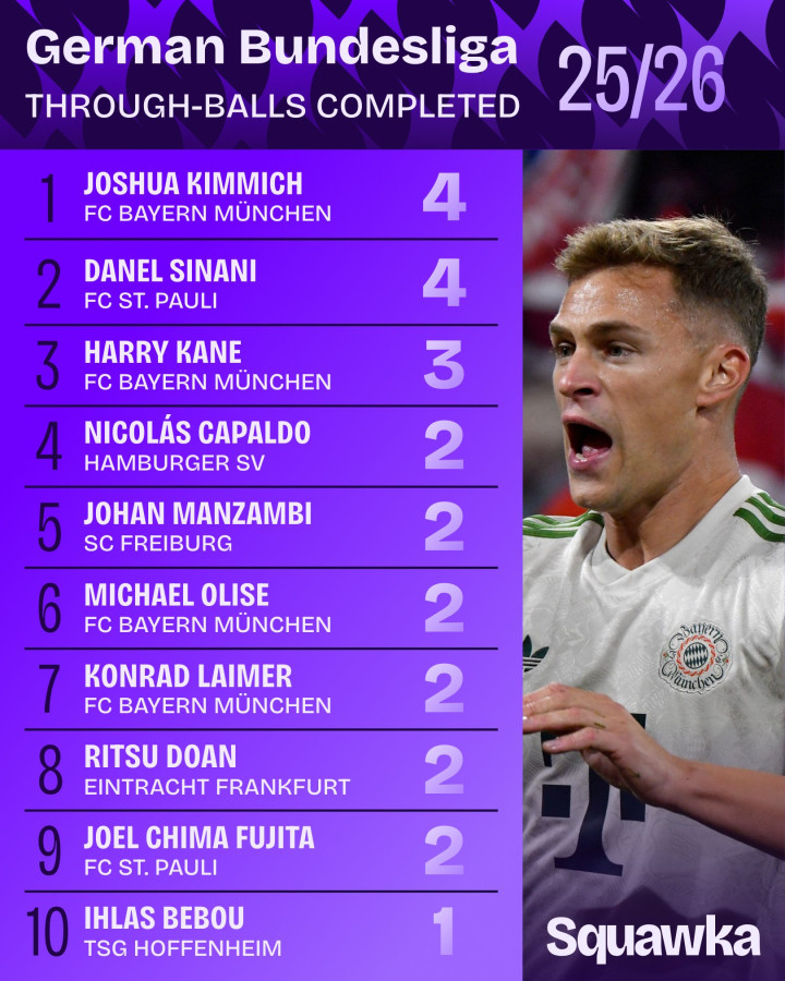 虎扑09月29日讯Squawka数据统计 德甲本赛季至今直塞球次数榜,基米希4次并列第一,英超免费高清直播凯恩3次排名第二。