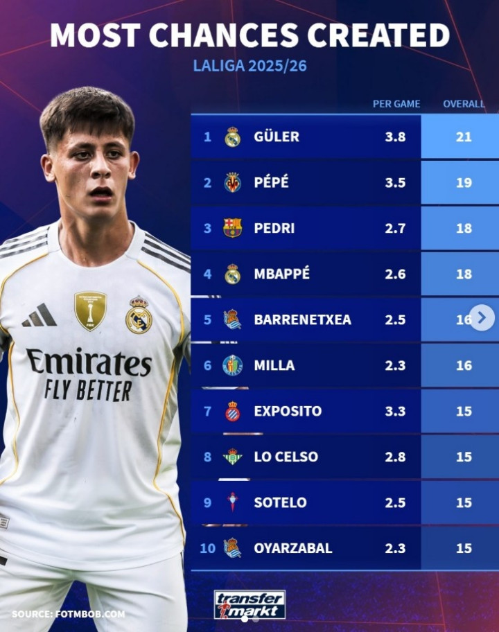 直播吧9月30日讯德转盘点了本赛季西甲创造机会榜单,其中居勒尔共计21次创造机会居首,具体如下(场均数据+总数据):