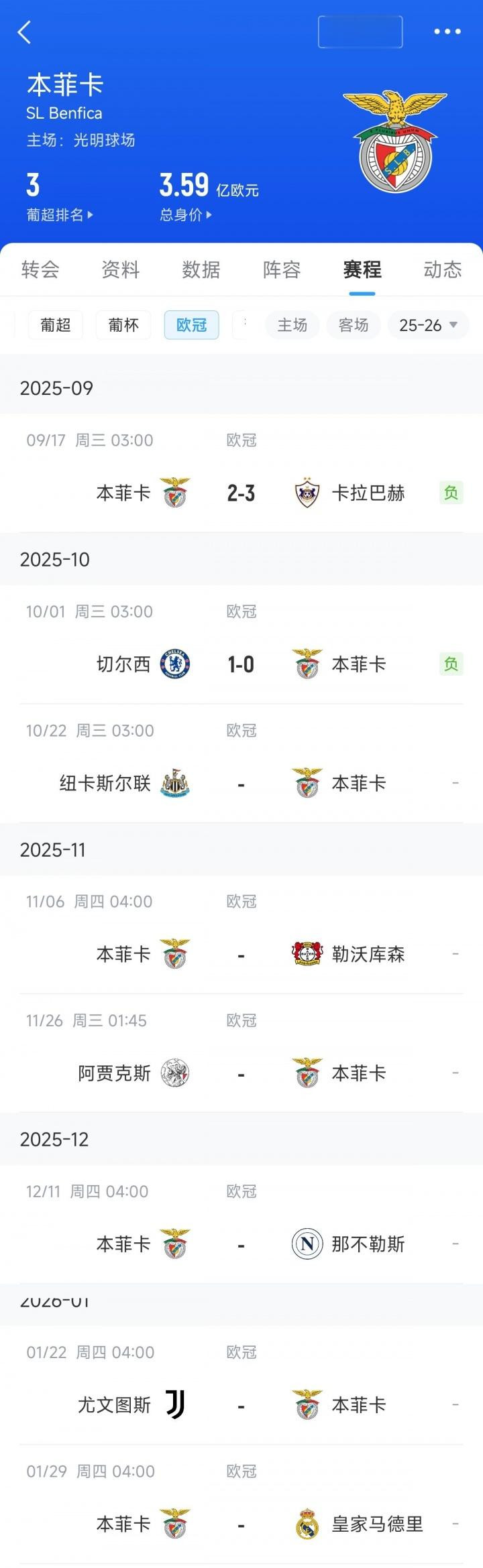 本菲卡本赛季的欧冠对手整体实力非常高,而他们首场赛事 2-3爆冷不敌弱旅卡拉巴赫,前主帅拉热也因此下课。穆帅接手之后,本菲卡客场应战 不敌切尔西,英超直播他接下来还将带队对阵:纽卡、勒沃库森、阿贾克斯、那不勒斯、尤文图斯、皇马,均是各国豪门劲旅。