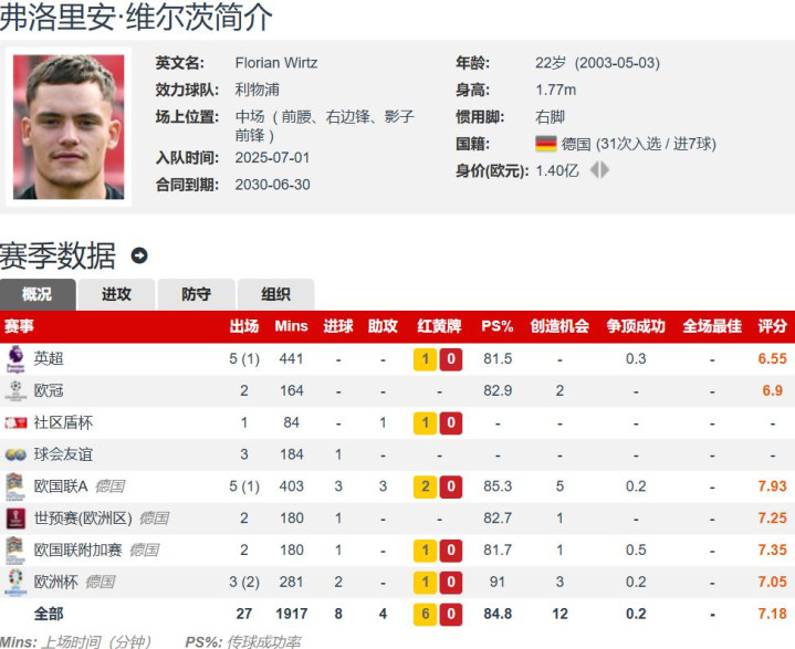 现年22岁的维尔茨,加盟利物浦后各项赛事出场9次,英超6场0球0助,欧冠2场0球0助,英超直播在线高清(无插件)仅在社区盾杯中送出一次助功 ,各项赛事合计出场9次(689分钟),0球1助,这数据身为攻击 型中场球员,1.25亿欧元的重磅引援,显得特别的格格不入。