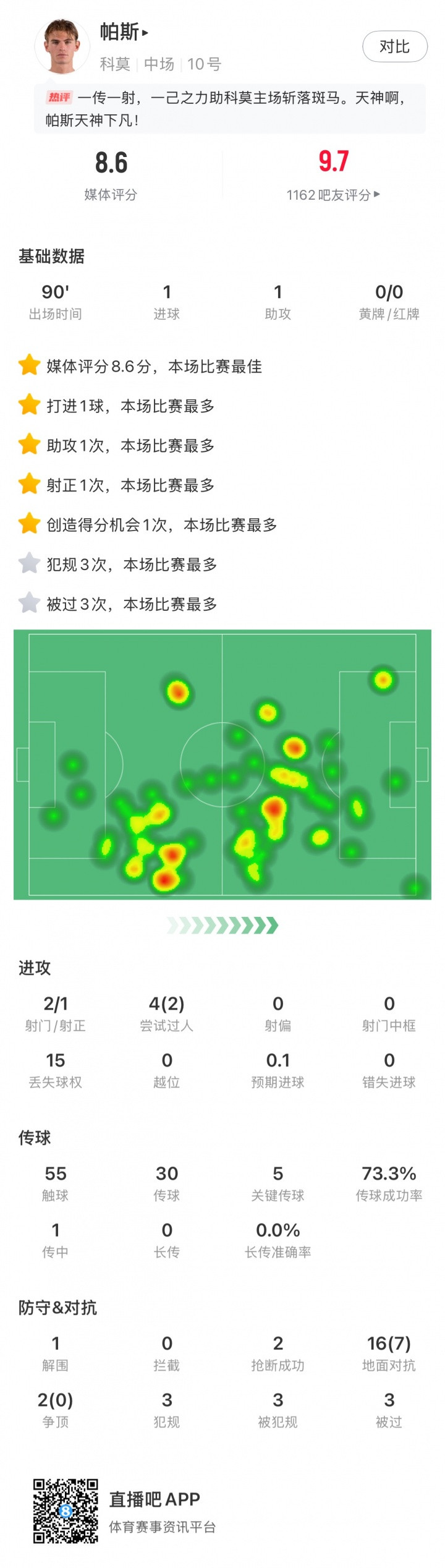 科莫1-1克雷莫内塞,帕斯12次地面对峙 成功7次