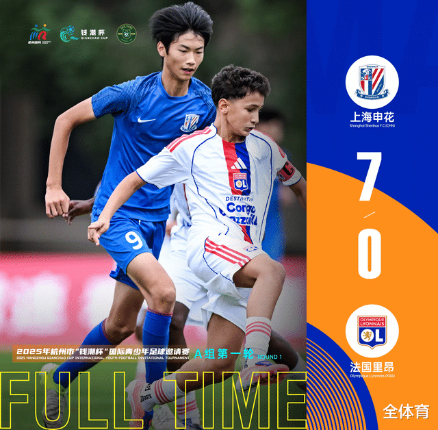 下半场,场面仍是一边倒,上海申花U14再进三球,将比分锁定为7:0!而法甲豪门里昂的U14梯队,则根本没有还手之力。